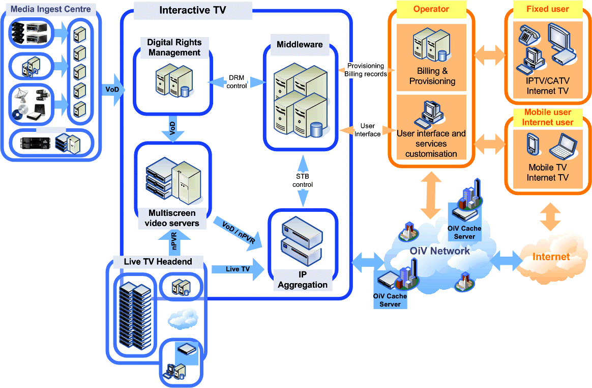 2) راديو - تلويزيون محور: در اين حالت کامپيوتري ابتدايي به نام Set-Top-Box که توانايي اتصال به اينترنت را هم دارد به تلويزيون وصل مي شود و درست مثل STB هاي متداول براي دريافت شبکه هاي ديجيتال، امکان استفاده از امکانات و سرويسهاي راديو و تلويزيون تعاملي ميسر مي شود.